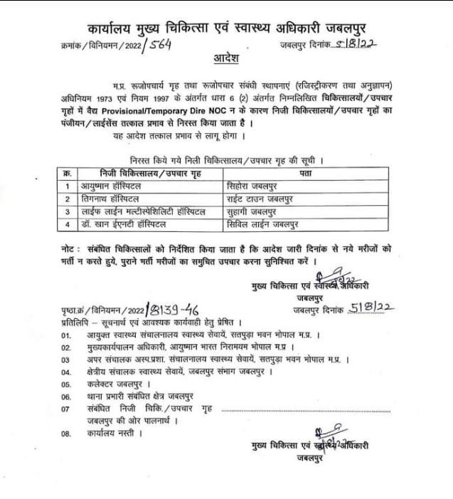 जबलपुर दर्पण नप्र। जिला कलेक्टर एव मुख्य चिकित्सा एवं स्वास्थ्य अधिकारी डॉ संजय मिश्रा के सक्त आदेश के चलते आज आयुष्मान हॉस्पिटल सिहोरा को मान्यता रद्द होने का आदेश देने पहुंचे डाक्टर के हाथ निराशा ही लगी जब आयुष्मान हॉस्पिटल सिहोरा के संचालक द्वारा मान्यता रद्द होने वाले आदेश को लेने से इंकार कर दिया जब बात नही बनी तो वरिष्ट अधिकारियो के निर्देश पर उक्त आदेश को शटर के कलम पर चिपका दिया गया। जब मुख्य चिकित्सा एवं स्वास्थ्य अधिकारी डॉ संजय मिश्रा से मान्यता रद्द होने वाले आदेश के संबंध में बात की गई तो उनका कहना था अभी हमने शाम को आदेश जारी किया है जिसमे शहर की 3 अस्पताल एव सिहोरा की एक अस्पताल शामिल है जिनकी मान्यता रद्द की गई है। चुकी इस पत्र की प्रति मीडिया को भी दी गई थी आज कल लोग मीडिया पर ज्यादा भरोसा नही करते है। जबकि जबलपुर दर्पण समाचार पत्र ने देर रात हुए भर्ती मरीज का वीडियो एव स्वास्थ्य विभाग द्वारा जारी पत्र भी खबर के साथ पोस्ट किया गया था। लेकिन फिर भी अस्पताल प्रबधन मरीजों का इलाज करता रहा