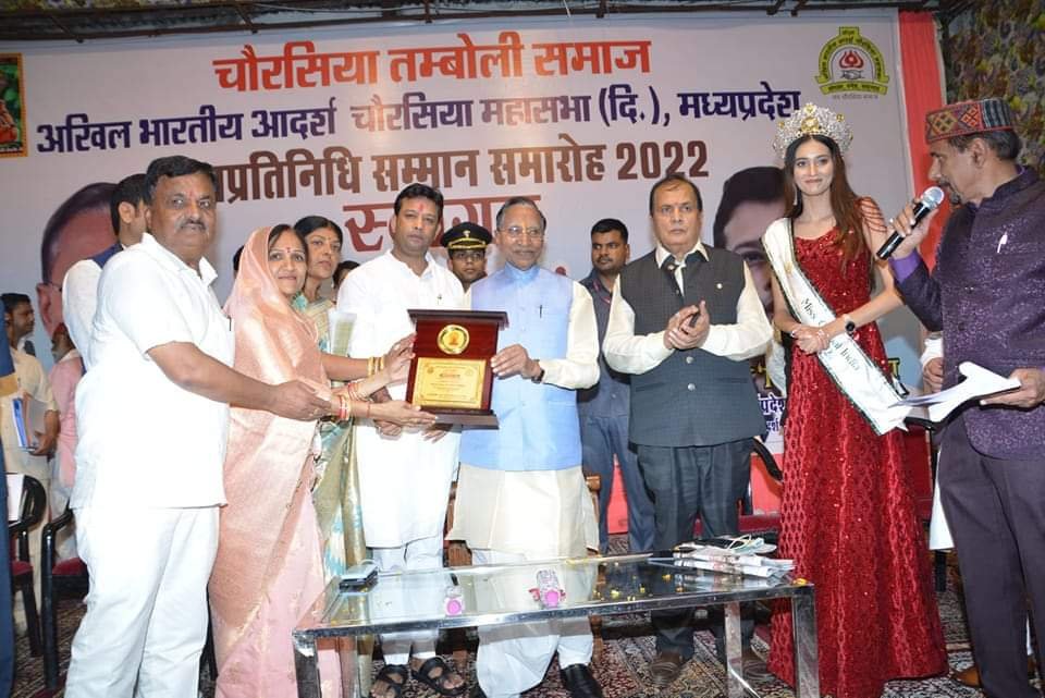 जबलपुर दर्पण। चौरसिया समाज नवयुवक मंडल के उपाध्यक्ष अनिकेत चौरसिया ने बताया कि भोपाल में आयोजित चौरसिया तम्बोली समाज अखिल भारतीय आदर्श चौरसिया मध्य प्रदेश महासभा द्वारा भोपाल के पालीटेक्निक चौराहा मानस भवन में 18 सितंबर रविवार को चौरसिया समाज के नवनिर्वाचित जनप्रतिनिधियों के सम्मान समारोह में सिक्किम के राज्यपाल गंगा प्रसाद चौरसिया द्वारा जबलपुर जिले के मझोली नगर पंचायत अध्यक्ष शिप्रा राजेन्द्र चौरसिया एवं मझौली जनपद अध्यक्ष श्रीमती विद्या दिनेश चौरसिया के साथ राधा विवेक चौरसिया सरपंच गांधीग्राम को सम्मानित किया गया। कार्यक्रम में मध्यप्रदेश शासन के कैबिनेट मंत्री विश्वास सारंग के अलावा अखिल भारतीय आदर्श चौरसिया मप्र महासभा के अध्यक्ष गौरव विक्की चौरसिया, चौरसिया समाज जबलपुर के अध्यक्ष योगेश चौरसिया एवं समाज के राष्ट्रीय पदाधिकारी और प्रदेश पदाधिकारी कार्यक्रम में मुख्य अतिथि के रूप मौजूद में मंचासीन रहे। सिक्किम के राज्यपाल गंगा प्रसाद चौरसिया ने समाज के प्रदेश भर से आए हुए नवनिर्वाचित लगभग 150 जनप्रतिनिधियों जिला पंचायत के सदस्य, जनपद पंचायत के सदस्य, जनपद पंचायत के अध्यक्ष, नगर पालिका / नगर परिषद के अध्यक्ष एवं पार्षदों सहित सरपंचों) को स्मृति चिन्ह प्रदान कर उन्हें सम्मानित किया गया। साथ ही राज्यपाल ने उनके उज्जवल भविष्य की कामना की।