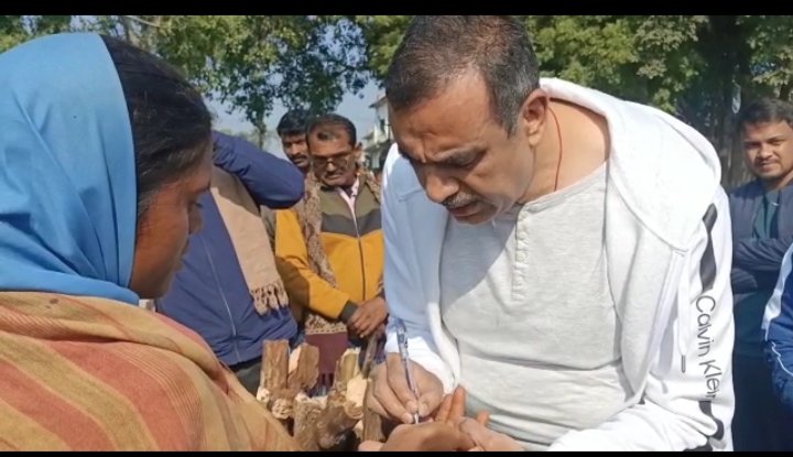 बैगा महिला के हाथों में कलेक्टर विकास मिश्रा ने लिखा मोबाइल नंबर