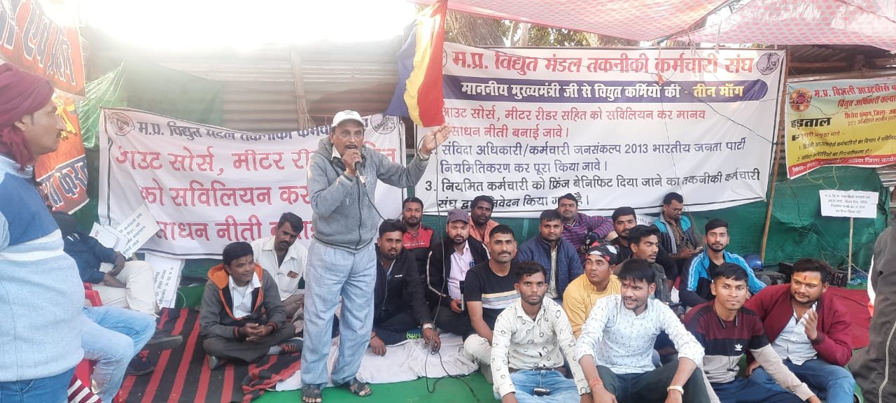 जबलपुर दर्पण। बिजली विभाग के समस्त संविदा आउटसोर्स कर्मचारी अधिकारी अपनी मांगो को लेकर अनिश्चितकालीन हड़ताल पर हैं जिस पर सरकार के द्वारा सहमति नहीं बन पा रही है जिसके कारण जिले व प्रदेश की विधुत व्यवस्था ठप हो रही है जिसके कारण आमजन, सरकारी विभाग व उधोग में प्रभाव पड़ रहा है कर्मचारी के हड़ताल में जाने से मध्यप्रदेश में ब्लैकआउट जैसे स्थिति निर्मित हो गई है कर्मचारियों का कहना है कि मुख्यमंत्री के द्वारा जब तक लिखित में मांगे पूरी नहीं होंगी तब तक हड़ताल जारी रहेगी प्रदर्शन में पहुंचे कांग्रेस विधायक विनय सक्सेना एव सौरव नाटी शर्मा एवं बबुआ शुक्ला जी एम मध्यप्रदेश विद्युत मंडल के प्रांतीय अध्यक्ष हरेंद्र श्रीवास्तव, जी एम आउट सोर्स के अध्यक्ष सुखदेव झरिया कुलदीप कुशवाहा सत्येंद्र हल्दकार प्रदीप बैरागी गोपाल कोरी शक्ति दुबे सुनील कामले राम वर्मा प्रिंस जैन महेंद्र कुशवाहा शेखू मरकाम एवम अन्य कर्मचारी और अधिकारी उपस्थित रहे।