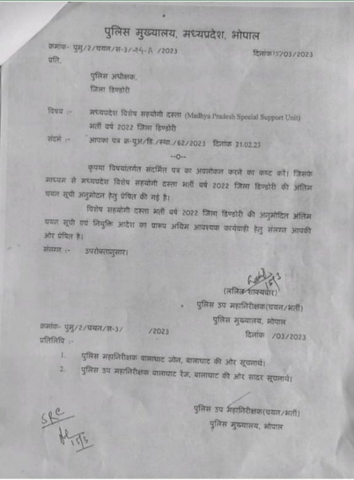 मध्यप्रदेश विशेष सहयोगी दस्ता भर्ती डिंडोरी में चयनित सूची का प्रकाशन