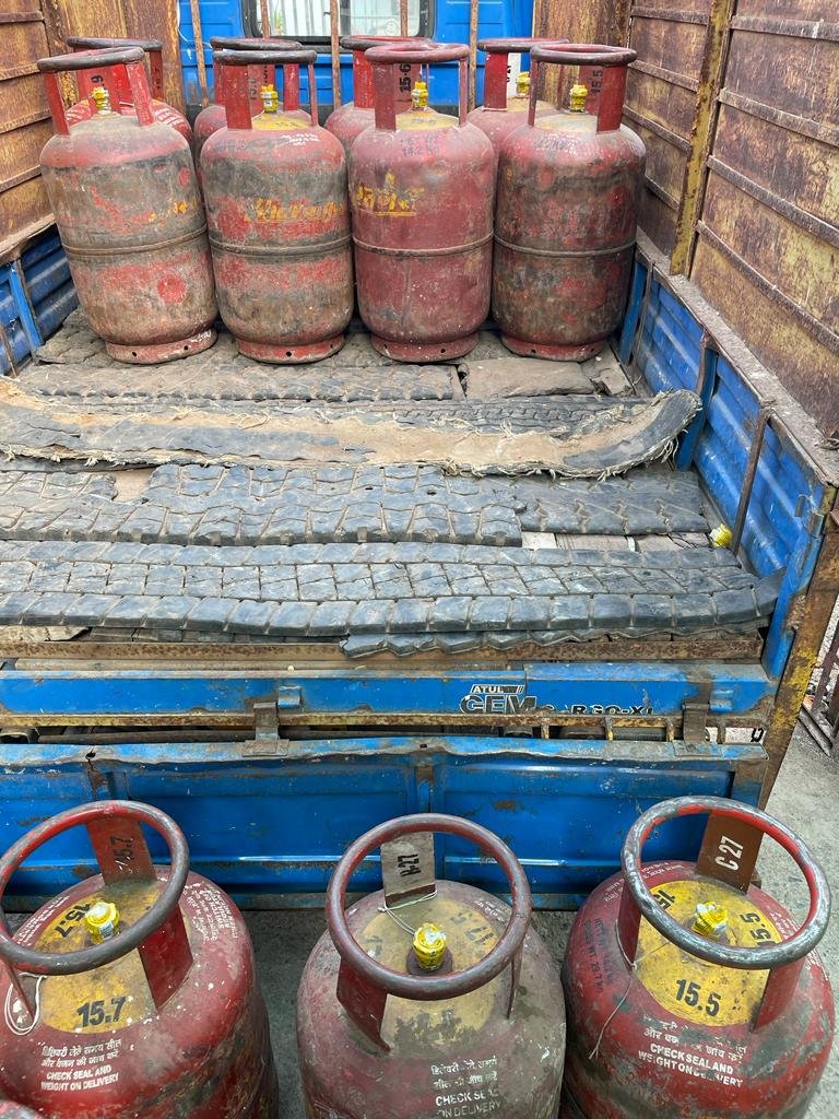 भरे सिलेण्डर से लापरवाही पूर्वक नोजल की सहायता से खाली गैस सिलेण्डर में गैस रिफ्लिंग करते आरोपी रंगे हाथ पकडा