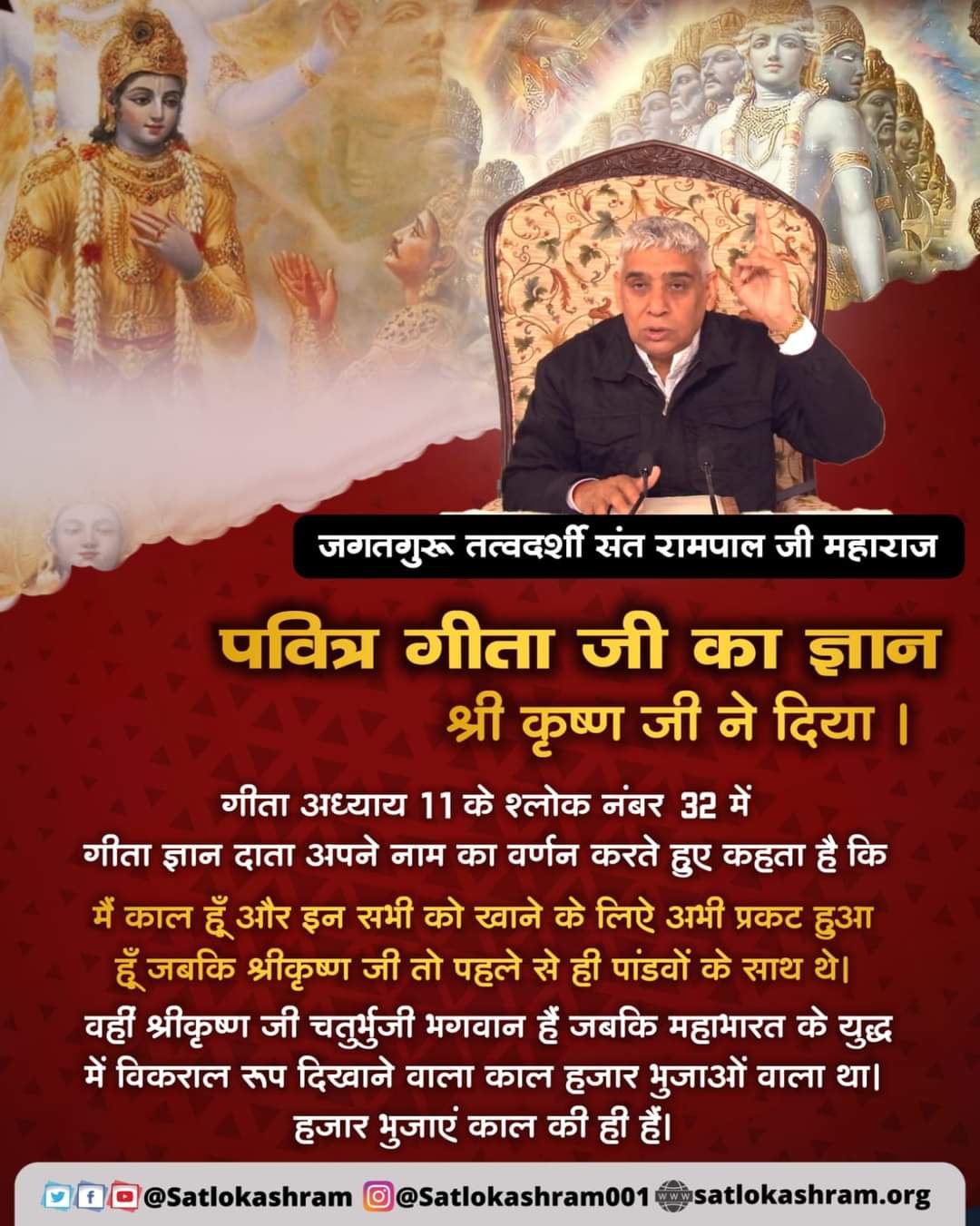 अध्याय 11 के श्लोक 21 में अर्जुन आँखों देखा हाल कह रहा है कि वे ही देवताओं के समूह आपमें भयभीत होकर आपके मुख में प्रवेश कर रहे हैं। कुछ भयभीत हो कर हाथ जोड़े आपके गुणों का उच्चारण (कीर्तन) करते हैं, ऋषियों-सिद्धों का समुदाय कल्याण हो! ऐसा कहकर उत्तम-2 स्त्रोतों द्वारा आपकी स्तुति करते हैं अर्थात् आप अपने उपासको को भी खा रहे हो। अध्याय 11 के श्लोक 15 से 30 तक में अर्जुन कह रहा है कि हे देव! आपके शरीर में सम्पूर्ण देवताओं तथा प्राणियों के समूह को तथा कमल पर ब्रह्मा को तथा सम्पूर्ण ऋषियों को देख रहा हूँ। और आपको कई भुजाओं, पेट, मुख और नेत्रों से युक्त देखता हूँ। परंतु इसका कोई वार-पार नहीं देख रहा हूँ तथा आपके इस भंयकर रूप को देख रहा हूँ।