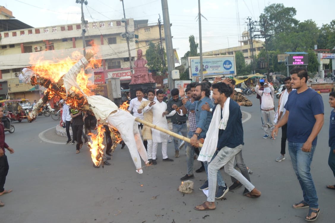 जबलपुर दर्पण । दिल्ली जंतर मंतर पर ब्रज भूषण सिंह की गिरफ्तारी की मांग को लेकर प्रदर्शन कर रहे हैं पहलवान खिलाड़ियों के साथ नरेंद्र मोदी सरकार के इशारे पर पुलिस की बर्बर कार्यवाही के विरोध में एवं पहलवानों के शोषण के आरोपी भाजपा सरकार के सांसद ब्रजभूषण सिंह के इस्तीफे की मांग को लेकर भारतीय राष्ट्रीय छात्र संगठन जिला इकाई अध्यक्ष सागर शुक्ला के नेतृत्व में आज सैकड़ों एनएसयूआई कार्यकर्ताओं ने मालवीय चौक चौराहे में प्रधानमंत्री नरेंद्र मोदी का पुतला दहन किया इस दौरान पुलिस एवं छात्र नेताओं में झड़प भी हुई।
