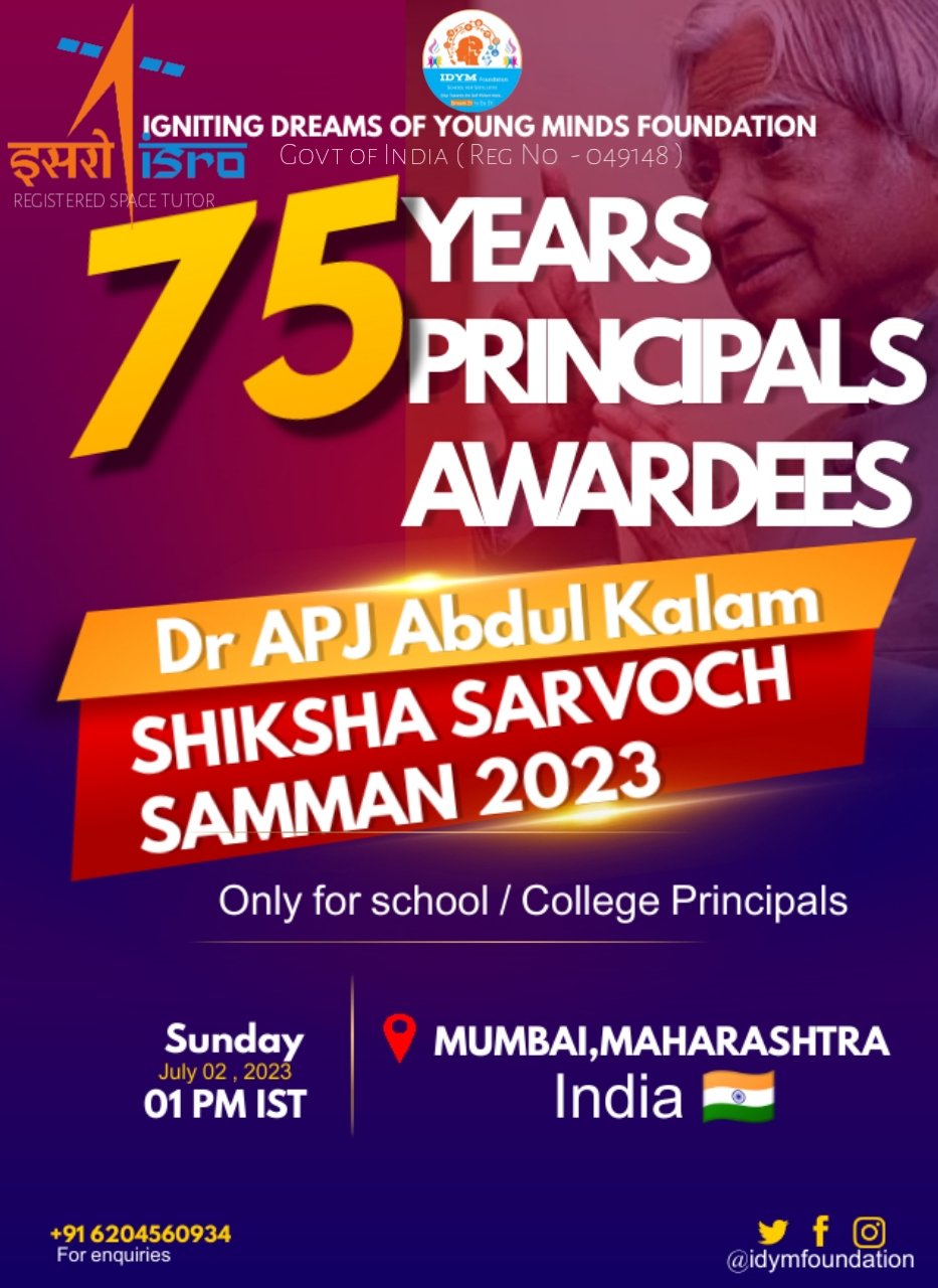 जबलपुर दर्पण। इग्नाइटिन ड्रीम्स ऑफ यंग माइंड फाउंडेशन संस्था जोकि जल्द ही भारत के 75 प्रधानाध्यापकों को डॉ. ए.पी.जे. अब्दुल कलाम शिक्षा सर्वोच्च सम्मान २०२३ सम्मानित किया जाएगा। कार्यक्रम ०२ जुलाई २०२३ अपराह्न ०१ बजे महाराष्ट्र के मुंबई मे होगा।