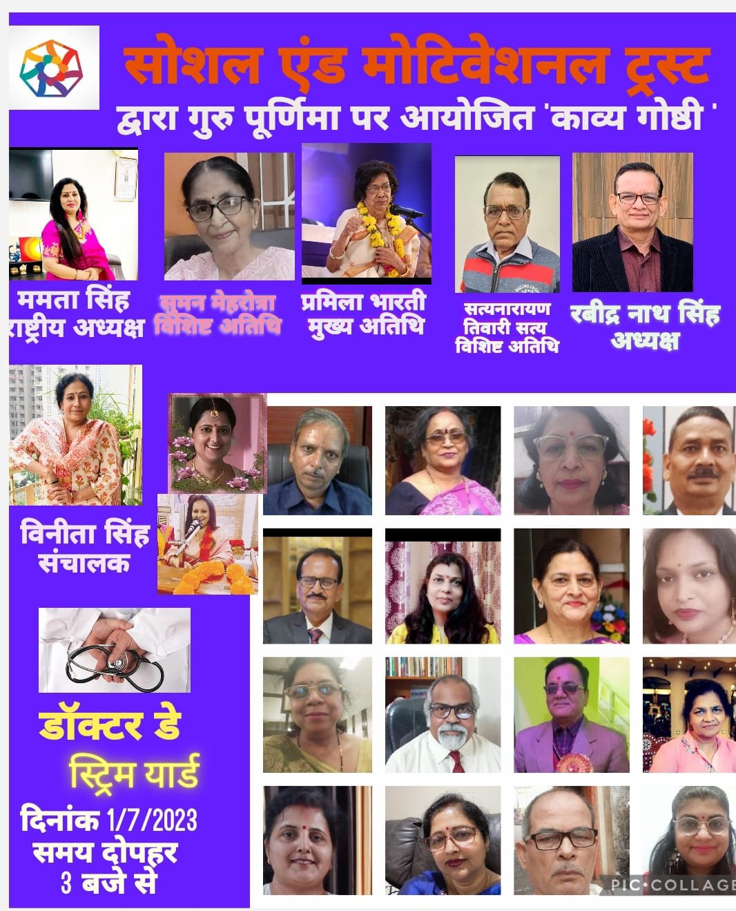 जबलपुर दर्पण। सोशल ऐंड मोटिवेशनल ट्रस्ट की नॉएडा इकाई के तत्वावधान में दिनांक 1/07/2023 को गुरू पूर्णिमा एवं डॉक्टर डे पर डिजिटल काव्य गोष्ठी का भव्य आयोजन हुआ।