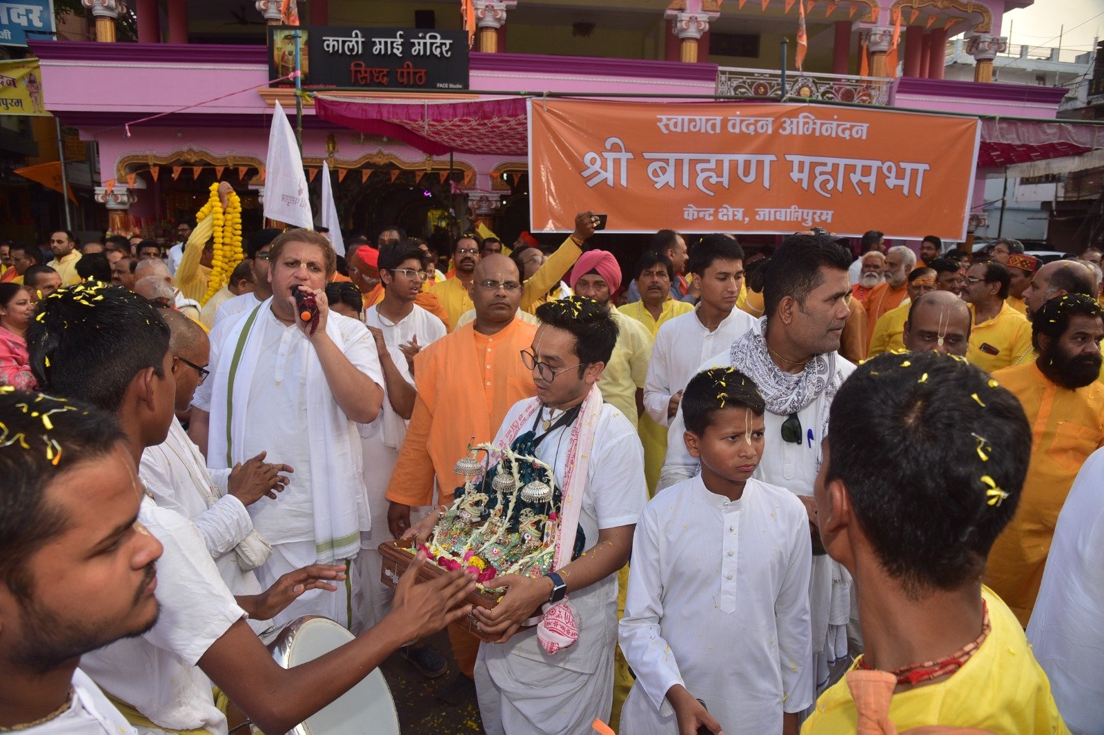 जबलपुर दर्पण। संस्कारधानी जबलपुर के संत महात्माओं के पावन सान्निध्य में, श्री ब्राह्मण महासभा, केंट क्षेत्र द्वारा संकल्पित विशाल शोभायात्रा का नेतृत्व स्व. गंगाप्रसाद तिवारी बाचपेयी अखाड़ा ने किया। शोभायात्रा में प.पू. स्वामी अखिलेश्वरानंद जी, प. पू. स्वामी नरसिंहदास जी, जगद्गुरु राघवदेवाचार्य जी, ब्रह्मचारी चैतन्यानंद जी एवं स्वामी राजारामाचार्य जी ने अपने परिकरों सहित उपस्थिति दर्ज की। श्रीकृष्ण भक्तिधारा के श्रील प्रभुपाद जी द्वारा स्थापित अन्तर्राष्ट्रीय श्रीकृष्ण भावनामृत संघ, शाखा जबलपुर की संकीर्तन मंडली डॉ. सिद्धार्थ सिंह जी के निर्देशन में मृदंग, झांझ मंजीरा बजाते हुए सुमधुर भजनों की प्रस्तुति करते हुए एवं वेद वाटिका गुरुकुल के विद्यार्थीगण घंट-घड़ियाल बजाते हुए, स्वस्तिवाचन उच्चारण करते हुए सदर की गलियों को भक्ति रस से सराबोर कर रहे थे।