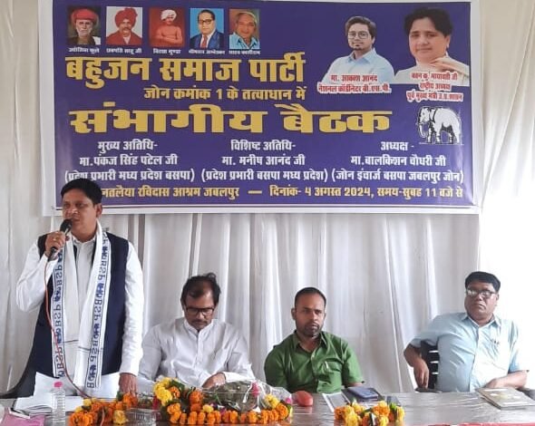 जबलपुर दर्पण। बहुजन समाज पार्टी जबलपुर में जोन स्तरीय बैठक का आयोजन किया गया मध्य प्रदेश के 30 जिलों के पदाधिकारीगण आमंत्रित किये गये कार्यक्रम में मुख्य अतिथी नव नियुक्त प्रदेश प्रभारी पंकज सिंह पटेल एवं मनीष आनंद ने कार्यक्रम को संबोधित करते हुए प्रदेश में चल रहे सदस्यता अभियान की जानकारी लेते हुए सभी पदाधिकारीगणों को संगठित होकर बसपा में अधिक से अधिक लोगों को जोडने की अपील की बसपा जोन इंचार्ज के कार्यक्रम की अध्यक्षता करते हुए कहा की पार्टी द्वारा युवा नौजवान, महिलाओ को संगठन में भागीदारी देने एवं प्रदेश में जिला, नगर, विधानसभा, सेक्टर कमेटियों में सक्रीय लोगों को जबावदारी दी जा रही है, भानतलैया रविदास आश्रम में आयोजित कार्यक्रम में बसपा के जोन इंचार्ज बालकिशन चौधरी,उमाकांत बंदेवार ,गोटिया,राकेश चौधरी, जिलाध्यक्ष एड.लखन अहिरवार, एड.दिनेश कुशवाहा, ईश्वरी बौद्ध, डाॅ सतपाल सिंह, राजमणी साकेत, लक्ष्मन चौधरी, सुधा सिंह,आशा गोटिया,सुशील राजा,रानी वर्मा, विकास पटेल,अमित कर्नल, रामपाल संकेत,मनोज सोनी, धीरेन्द्र पटेल, ओ.पी.पटेल, रामजी सतनामी, सहित प्रदेश के आधे से ज्यादा जिलों के पदाधिकारीगण उपस्थित रहे.