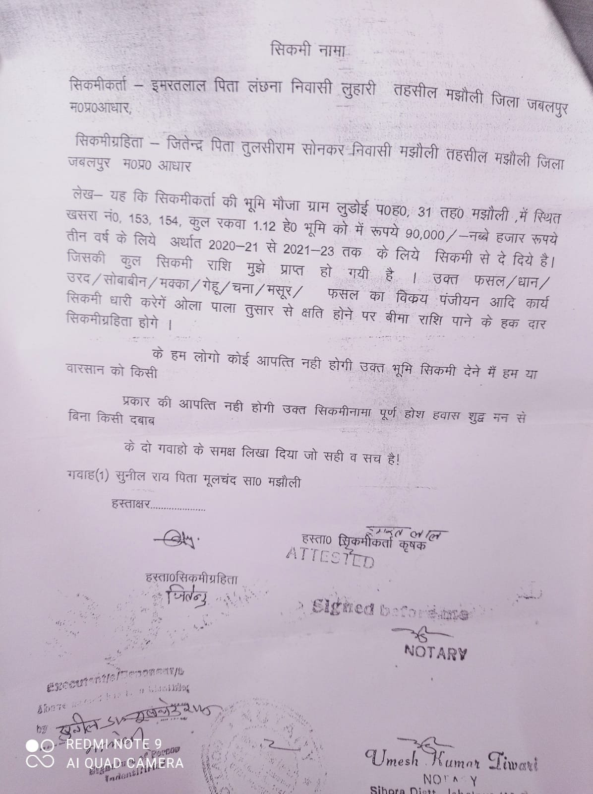 जबलपुर दर्पण संवाददाता सिहोरा संवाददाता। ऐसा ही मामला मझौली तहसील का है बिचोलिये जितेंद्र सोनकर पिता तुलसीराम सोनकर निवासी मझौली हैं जो फर्जी तरीके से रजिस्ट्रेशन करा लिया है जहां पर किसान मंत्री लाल काछी उर्फ अमृतलाल निवासी लड़ोई जिनकी कृषि भूमि ग्राम लड़ोई में स्थित है आज दिनांक को जब वह अपने भूमि का गेहूं पंजीयन कराने के लिए एमपी ऑनलाइन किओस्क सेंटर पहुंचे तो उन्हें जानकारी लगी कि उनकी भूमि का पंजीयन पूर्व में ही करा लिया गया है किसान यह बात सुनकर अचंभित रह गया कि उसके द्वारा किसी भी व्यक्ति के नाम पर सिक मीनामा नहीं लिखा गया है जानकारी प्राप्त हुई कि उपरोक्त किसान का फर्जी रजिस्ट्रेशन सेवा सहकारी संस्था मझौली में कराया गया है जिसमें कि ₹500 का स्टांप नोटरी सहित लगाया गया है परंतु उसमें किसान अमृतलाल के हस्ताक्षर फर्जी है इस बात की पुष्टि स्वयं किसान अमृतलाल ने की है किसान अमृतलाल के नाम पर ग्राम लड़ाई में खसरा नंबर 153, 154 कुल रकबा 1.12 हेक्टेयर भूमि है जिसका पंजीयन बिना बताए सिकमीनामा बनवाकर फर्जी तरीके से कर लिया गया है उक्त उक्त मामले की जानकारी मझौली तहसीलदार प्रदीप मिश्रा को दी गई है उनके द्वारा उचित कार्रवाई का आश्वासन दिया गया है एवं फर्जी तरीके फर्जी कराए गए इस रजिस्ट्रेशन एवं रजिस्ट्रेशन करता के विरुद्ध उचित कार्रवाई की जाए ताकि भविष्य में इस प्रकार के कार्य की पुनरावृत्ति ना हो इस बात का भी विशेष ध्यान देना होगा कि बिना किसान के हस्ताक्षर किए प्रकार से इस सिकमीनामा में नौटरी कर दी गई जबकि किसान वहां पर उपस्थित नहीं था।