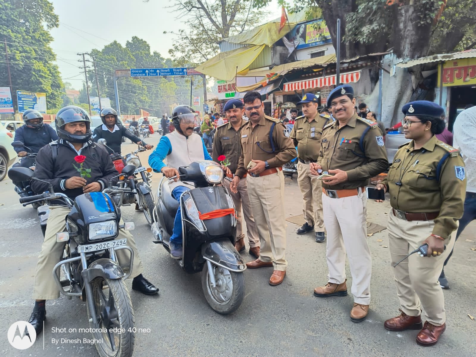 यातायात नियमों का पालन करते हुये वाहन चलाने वालों को दिये गये गुलाब के फूल
